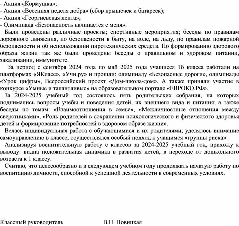 Анализируя воспитательную работу с классов за 2024-2025 учебный год, прихожу к выводу: видна положительная динамика в развития детей, в переходе от дошкольного возраста к 1 классу.