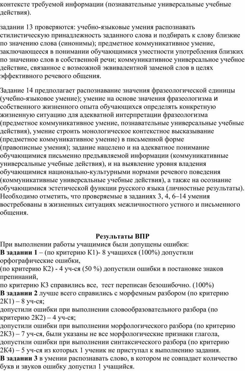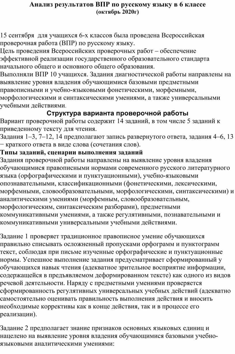 Анализ результатов ВПР по русскому языку в 6 классе