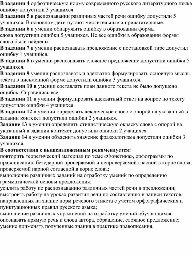 В задании 6 в умении обнаружить ошибку в образовании формы слова допустили ошибки 5 учащихся. Не все ошибки в образовании формы слова были найдены.