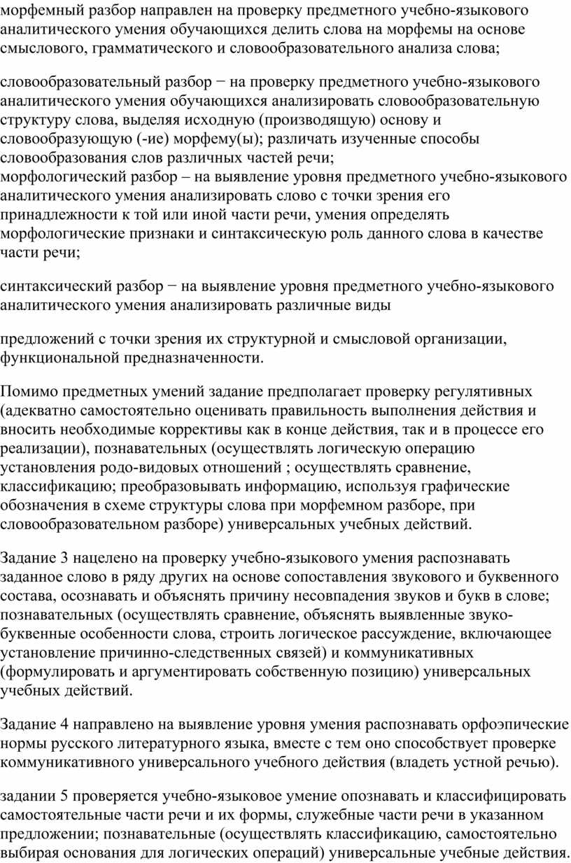 Задания проверочной работы направлены на выявление уровня владения обучающимися правописными нормами современного русского литературного языка (орфографическими и пунктуационными), учебно-языковыми опознавательными, классификационными (фонетическими, лексическими, морфемными, словообразовательными, морфологическими, синтаксическими) и аналитическими умениями (морфемным, словообразовательным, морфологическим, синтаксическим разборами), предметными коммуникативными умениями, а также регулятивными, познавательными и коммуникативными универсальными учебными действиями.