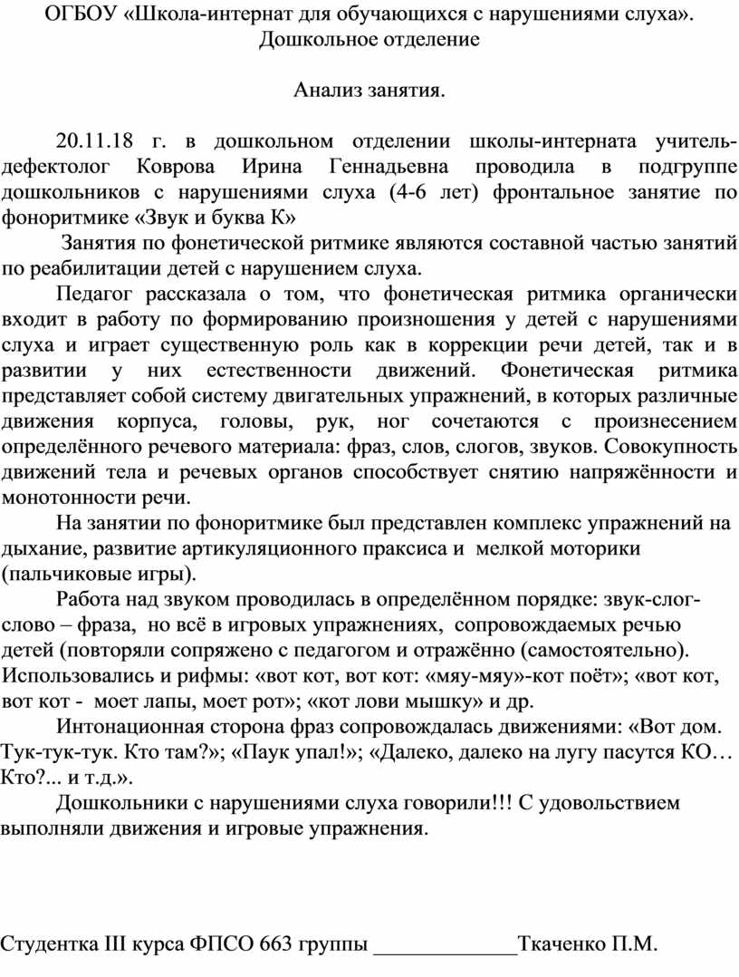 20.11.18 г. в дошкольном отделении школы-интерната учитель-дефектолог Коврова Ирина Геннадьевна проводила в подгруппе дошкольников с нарушениями слуха (4-6 лет) фронтальное занятие по фоноритмике «Звук и буква К»