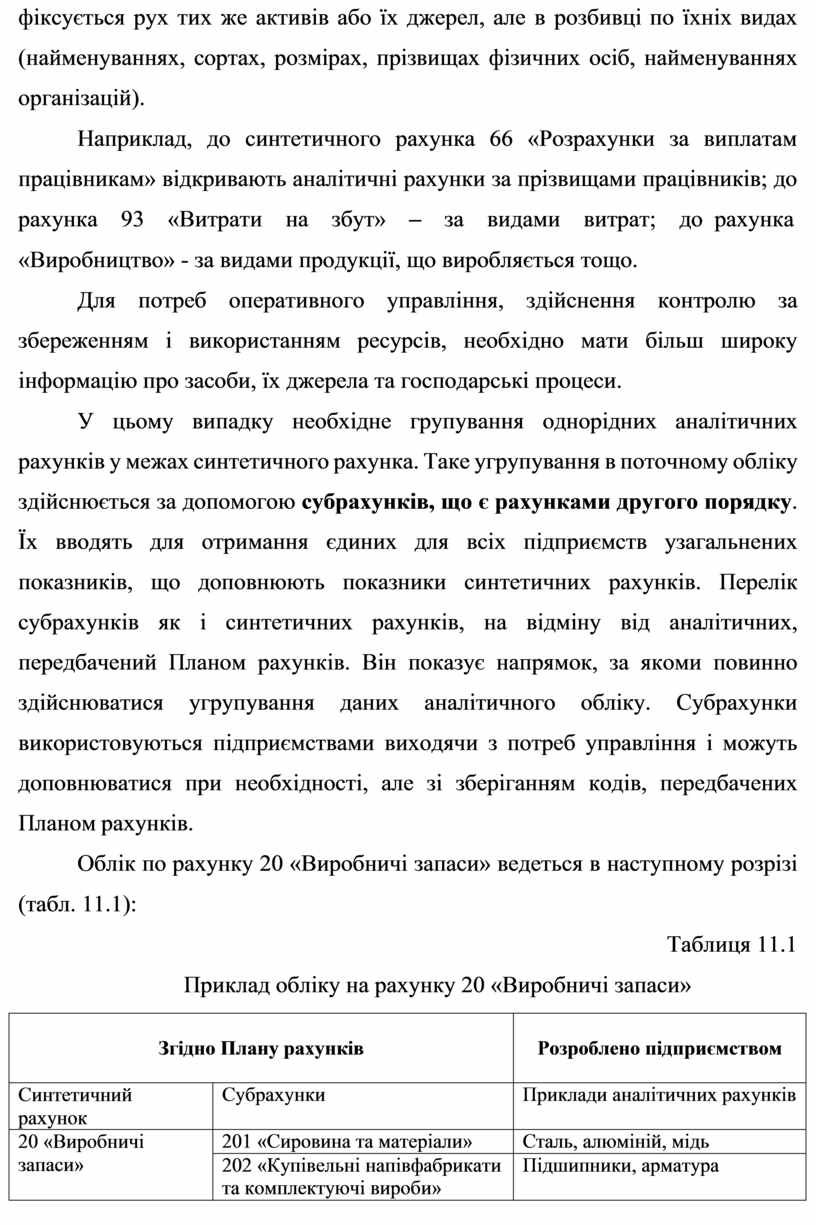 Облік по рахунку 20 «Виробничі запаси» ведеться в наступному розрізі (табл. 11.1):