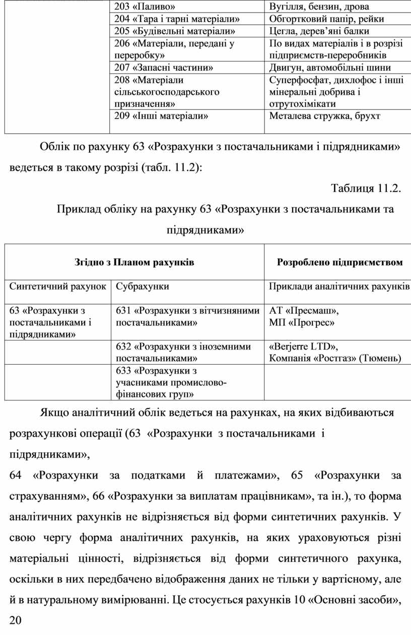 Облік по рахунку 63 «Розрахунки з постачальниками і підрядниками» ведеться в такому розрізі (табл. 11.2):
