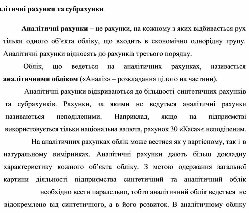 Аналітичні рахунки відкриваються до більшості синтетичних рахунків та субрахунків. Рахунки, за якими не ведуться аналітичні рахунки називаються неподіленими. Наприклад, якщо на підприємстві використовується тільки національна валюта, рахунок 30 «Каса» є неподіленим. На аналітичних рахунках облік може вестися як у вартісному, так і в натуральному вимірниках. Аналітичні рахунки дають більш докладну характеристику кожного об’єкта обліку. З метою одержання загальної картини діяльності підприємства синтетичний та аналітичний облік необхідно вести паралельно, тобто аналітичний облік ведеться не відокремлено від синтетичного, а в його розвиток. В аналітичному обліку