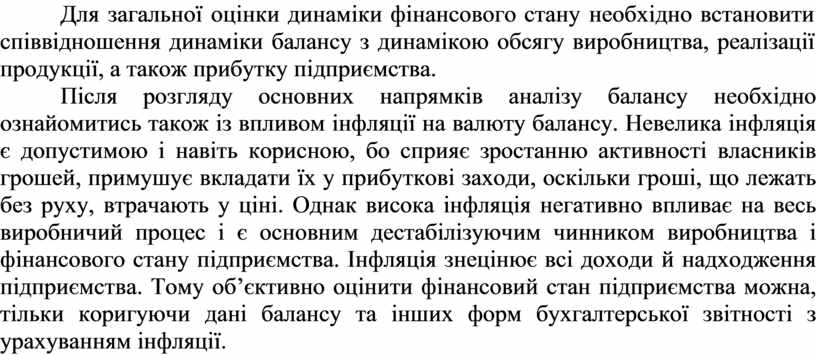 Після розгляду основних напрямків аналізу балансу необхідно ознайомитись також із впливом інфляції на валюту балансу. Невелика інфляція є допустимою і навіть корисною, бо сприяє зростанню активності власників грошей, примушує вкладати їх у прибуткові заходи, оскільки гроші, що лежать без руху, втрачають у ціні. Однак висока інфляція негативно впливає на весь виробничий процес і є основним дестабілізуючим чинником виробництва і фінансового стану підприємства. Інфляція знецінює всі доходи й надходження підприємства. Тому об’єктивно оцінити фінансовий стан підприємства можна, тільки коригуючи дані балансу та інших форм бухгалтерської звітності з урахуванням інфляції.