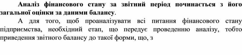А для того, щоб проаналізувати всі питання фінансового стану підприємства, необхідний етап, що передує проведенню аналізу, тобто приведення звітного балансу до такої форми, що, з