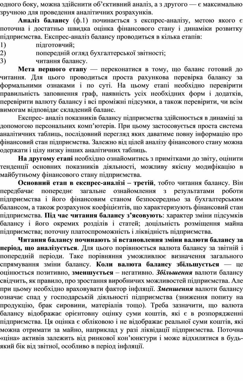 Аналіз балансу (ф.1) починається з експрес-аналізу, метою якого є поточна і достатньо швидка оцінка фінансового стану і динаміки розвитку підприємства. Експрес-аналіз балансу проводиться в кілька етапів:
