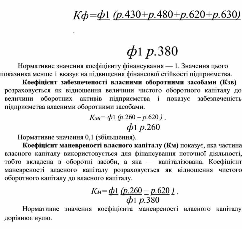 Коефіцієнт фінансування (Кф) розраховується як співвідношення залучених та власних засобів і характеризує залежність підприємства від залучених засобів.