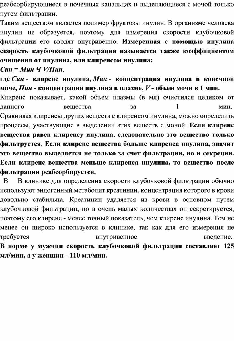 где Син - клиренс инулина, Мин - концентрация инулина в конечной моче, Пин - концентрация инулина в плазме, V - объем мочи в 1 мин.