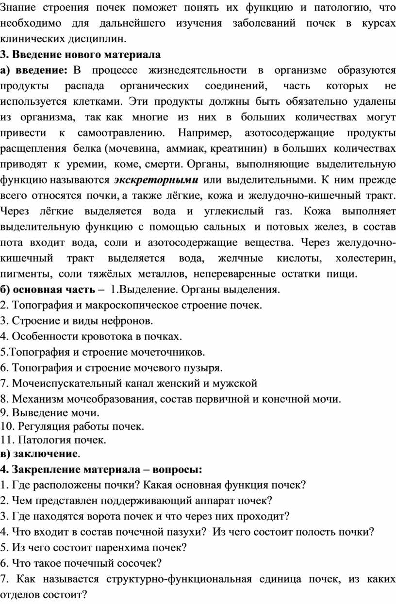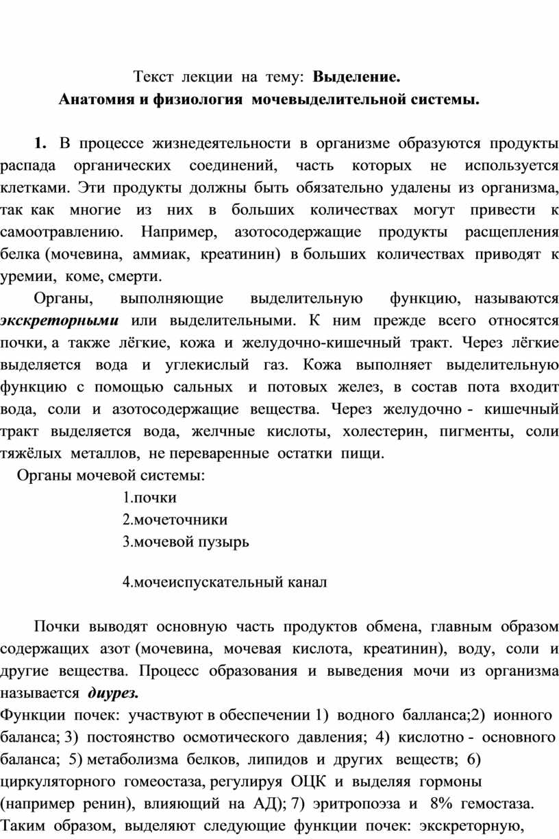 а) введение: В процессе жизнедеятельности в организме образуются продукты распада органических соединений, часть которых не используется клетками. Эти продукты должны быть обязательно удалены из организма, так как многие из них в больших количествах могут привести к самоотравлению. Например, азотосодержащие продукты расщепления белка (мочевина, аммиак, креатинин) в больших количествах приводят к уремии, коме, смерти. Органы, выполняющие выделительную функцию называются экскреторными или выделительными. К ним прежде всего относятся почки, а также лёгкие, кожа и желудочно-кишечный тракт. Через лёгкие выделяется вода и углекислый газ. Кожа выполняет выделительную функцию с помощью сальных и потовых желез, в состав пота входит вода, соли и азотосодержащие вещества. Через желудочно-кишечный тракт выделяется вода, желчные кислоты, холестерин, пигменты, соли тяжёлых металлов, непереваренные остатки пищи.