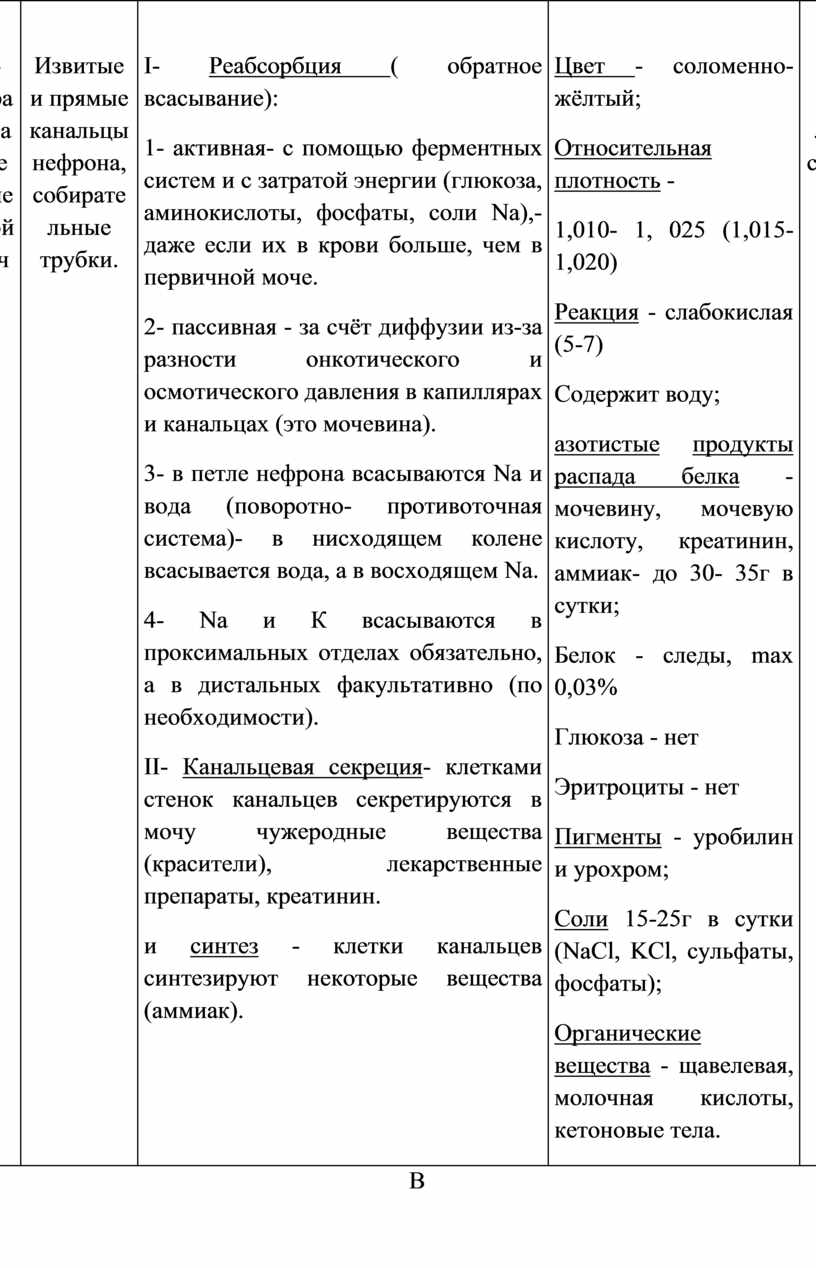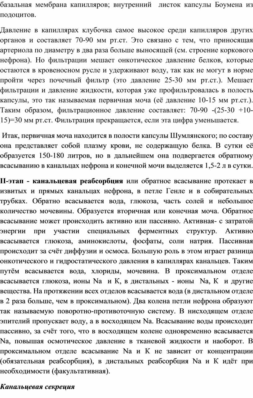 I- Реабсорбция ( обратное всасывание): 1- активная- с помощью ферментных систем и с затратой энергии (глюкоза, аминокислоты, фосфаты, соли Nа),- даже если их в крови больше, чем в первичной моче. 2- пассивная - за счёт диффузии из-за разности онкотического и осмотического давления в капиллярах и канальцах (это мочевина). 3- в петле нефрона всасываются Nа и вода (поворотно- противоточная система)- в нисходящем колене всасывается вода, а в восходящем Nа. 4- Nа и К всасываются в проксимальных отделах обязательно, а в дистальных факультативно (по необходимости). II- Канальцевая секреция- клетками стенок канальцев секретируются в мочу чужеродные вещества (красители), лекарственные препараты, креатинин. и синтез - клетки канальцев синтезируют некоторые вещества (аммиак). |