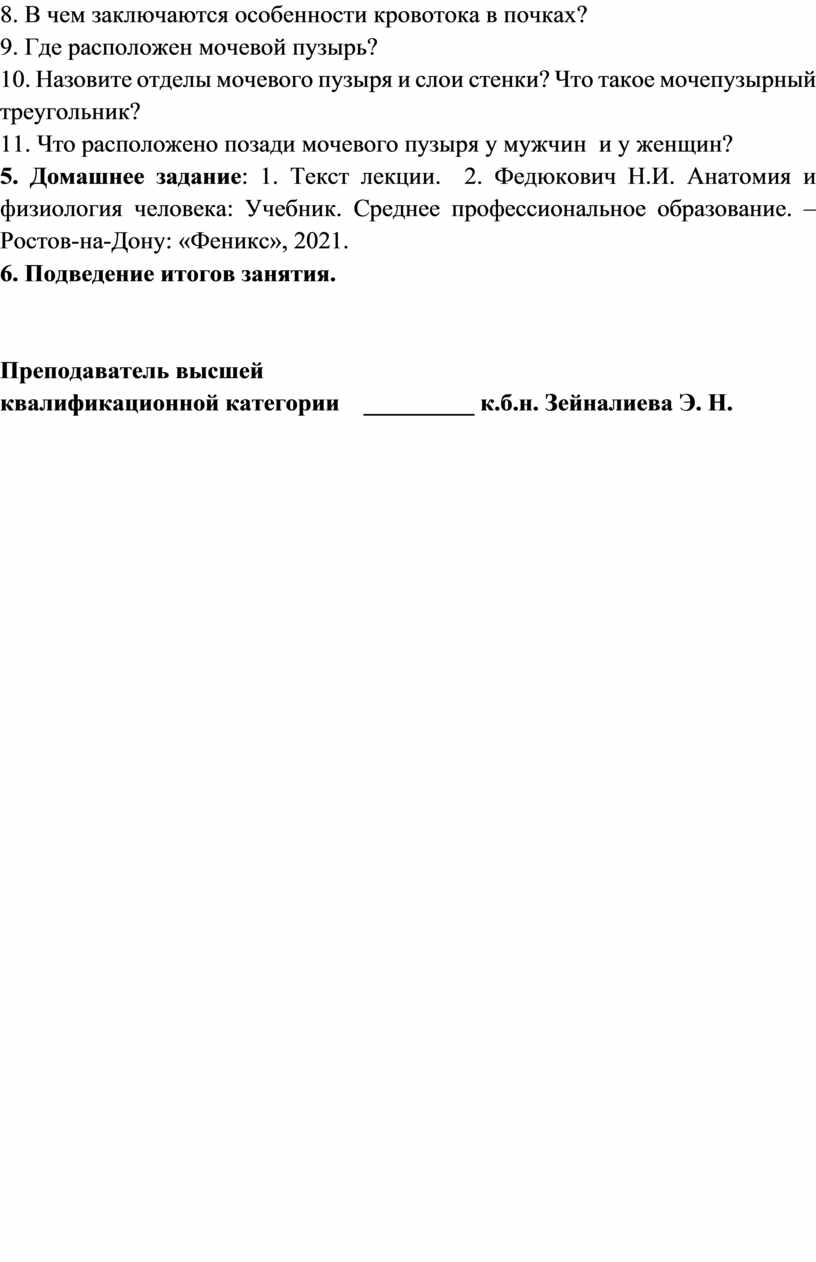 5. Домашнее задание: 1. Текст лекции. 2. Федюкович Н.И. Анатомия и физиология человека: Учебник. Среднее профессиональное образование. – Ростов-на-Дону: «Феникс», 2021.