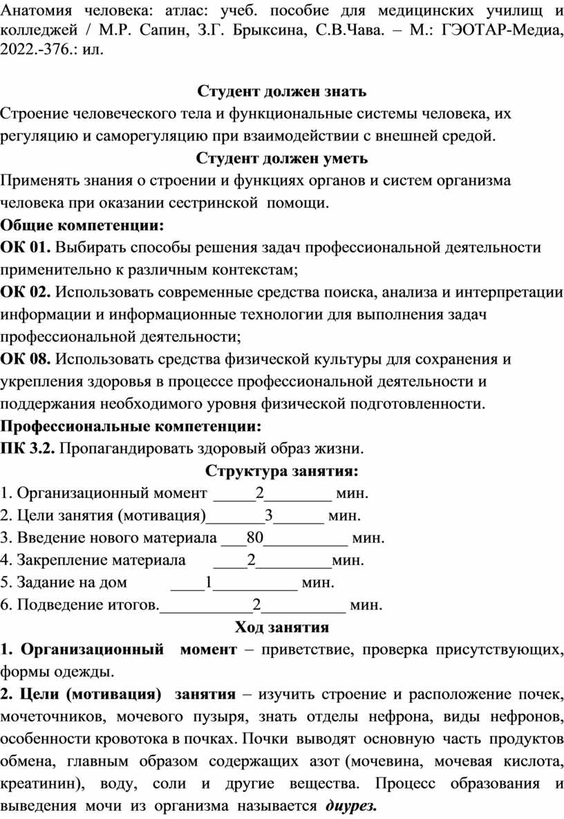 1. Анатомия человека: атлас: учеб. пособие для медицинских училищ и колледжей / М.Р. Сапин, З.Г. Брыксина, С.В.Чава. – М.: ГЭОТАР-Медиа, 2022.-376.: ил.