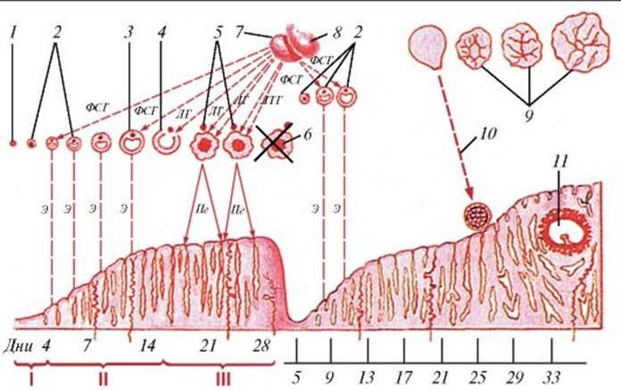 Рис. 3. Овариально-менструальный цикл: I - менструальная фаза; II - постменструальная фаза; III - предменструальная фаза; 1 - примордиальный фолликул в яичнике; 2 - первичные (растущие) фолликулы; 3 - вторичный фолликул (граафов пузырек); 4 - овуляция; 5 - желтое тело в стадии расцвета; 6 - обратное развитие желтого тела; 7 - передняя доля гипофиза; 8 - задняя доля гипофиза; 9 - желтое тело беременности; 10 - оплодотворение; 11 - имплантированный зародыш. Стрелками показано действие фоллитропина (ФСГ) на растущие фолликулы, лютропина (ЛГ) - на овуляцию и образование желтых тел, лактотропина (пролактина, ЛТГ) - на сформированное желтое тело, действие эстрогена (Э), стимулирующее рост эндометрия, - на матку (постменструальная, или пролиферативная, фаза), прогестерона (Пг) - на эндометрий (предменструальная фаза).