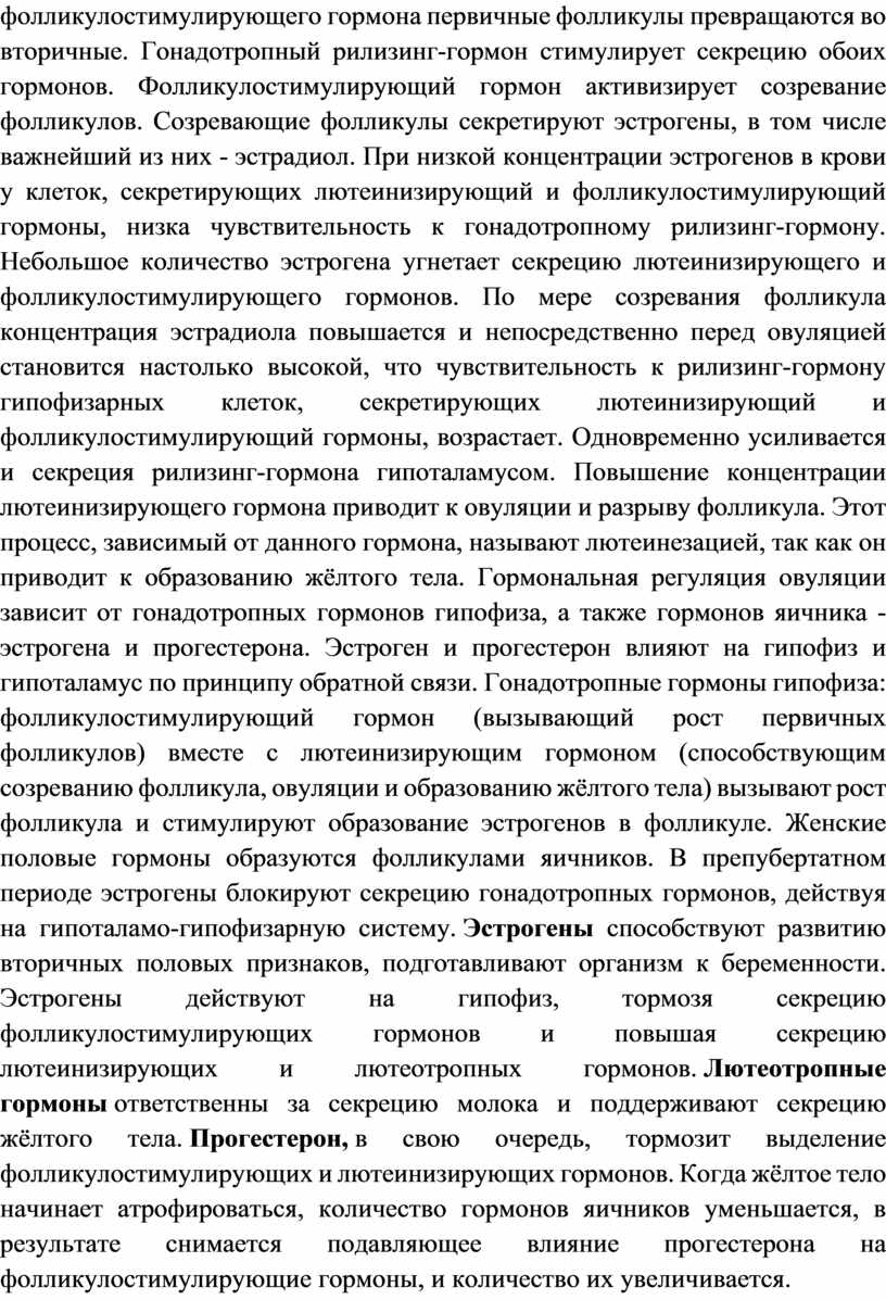 6. Регуляция половых функций человека. Половые функции и мужчин, и женщин регулируются, в основном, гормонами. Регуляторная система «гипоталамус-гипофиз-яичники» функционирует следующим образом. В гипоталамусе вырабатывается гонадотропный рилизинг-гормон, выделяющийся в кровь. В гипофизе этот гормон взаимодействует с рецепторами на поверхности клеток, синтезирующих лютеинизирующий гормон и фолликулостимулирующий гормон. В результате секреции фолликулостимулирующего гормона первичные фолликулы превращаются во вторичные. Гонадотропный рилизинг-гормон стимулирует секрецию обоих гормонов. Фолликулостимулирующий гормон активизирует созревание фолликулов. Созревающие фолликулы секретируют эстрогены, в том числе важнейший из них - эстрадиол. При низкой концентрации эстрогенов в крови у клеток, секретирующих лютеинизирующий и фолликулостимулирующий гормоны, низка чувствительность к гонадотропному рилизинг-гормону. Небольшое количество эстрогена угнетает секрецию лютеинизирующего и фолликулостимулирующего гормонов. По мере созревания фолликула концентрация эстрадиола повышается и непосредственно перед овуляцией становится настолько высокой, что чувствительность к рилизинг-гормону гипофизарных клеток, секретирующих лютеинизирующий и фолликулостимулирующий гормоны, возрастает. Одновременно усиливается и секреция рилизинг-гормона гипоталамусом. Повышение концентрации лютеинизирующего гормона приводит к овуляции и разрыву фолликула. Этот процесс, зависимый от данного гормона, называют лютеинезацией, так как он приводит к образованию жёлтого тела. Гормональная регуляция овуляции зависит от гонадотропных гормонов гипофиза, а также гормонов яичника - эстрогена и прогестерона. Эстроген и прогестерон влияют на гипофиз и гипоталамус по принципу обратной связи. Гонадотропные гормоны гипофиза: фолликулостимулирующий гормон (вызывающий рост первичных фолликулов) вместе с лютеинизирующим гормоном (способствующим созреванию фолликула, овуляции и образованию жёлтого тела) вызывают рост фолликула и стимулируют образование эстрогенов в фолликуле. Женские половые гормоны образуются фолликулами яичников. В препубертатном периоде эстрогены блокируют секрецию гонадотропных гормонов, действуя на гипоталамо-гипофизарную систему. Эстрогены способствуют развитию вторичных половых признаков, подготавливают организм к беременности. Эстрогены действуют на гипофиз, тормозя секрецию фолликулостимулирующих гормонов и повышая секрецию лютеинизирующих и лютеотропных гормонов. Лютеотропные гормоны ответственны за секрецию молока и поддерживают секрецию жёлтого тела. Прогестерон, в свою очередь, тормозит выделение фолликулостимулирующих и лютеинизирующих гормонов. Когда жёлтое тело начинает атрофироваться, количество гормонов яичников уменьшается, в результате снимается подавляющее влияние прогестерона на фолликулостимулирующие гормоны, и количество их увеличивается.