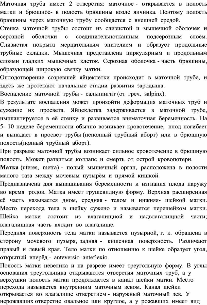 Маточная труба (tuba uterina)- парный орган, длиной 10-12см и служит для проведения яйцеклетки в матку. Она находится в полости малого таза сбоку от матки, в верхнем отделе её широкой связки. В маточной трубе различают несколько отделов: маточную часть, перешеек, ампулу и воронку. Маточная часть находится в стенке матки. Перешеек - суженная часть трубы, переходит в расширенную часть- ампулу. Воронка маточной трубы обращена к яичнику, края её разделены на бахромки. Самая большая из них - яичниковая, - прикрепляется к трубному концу яичника.