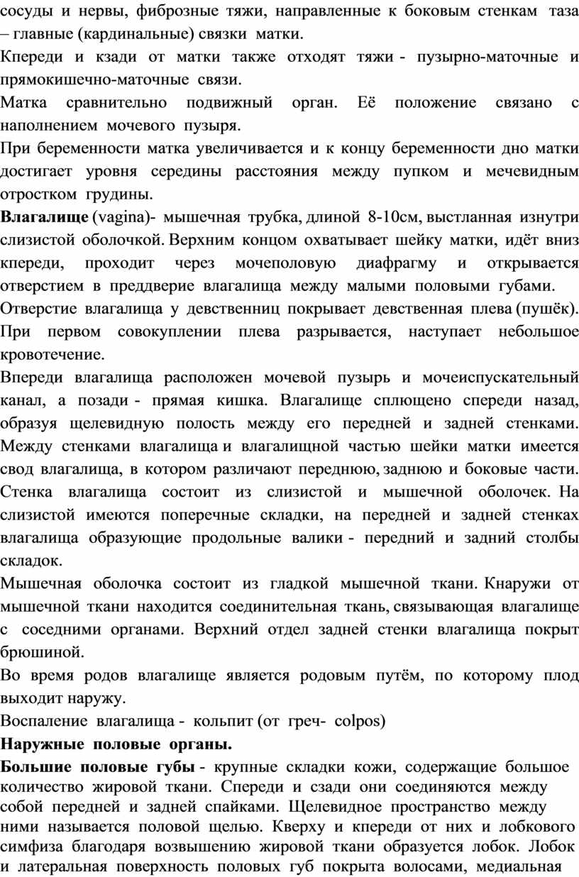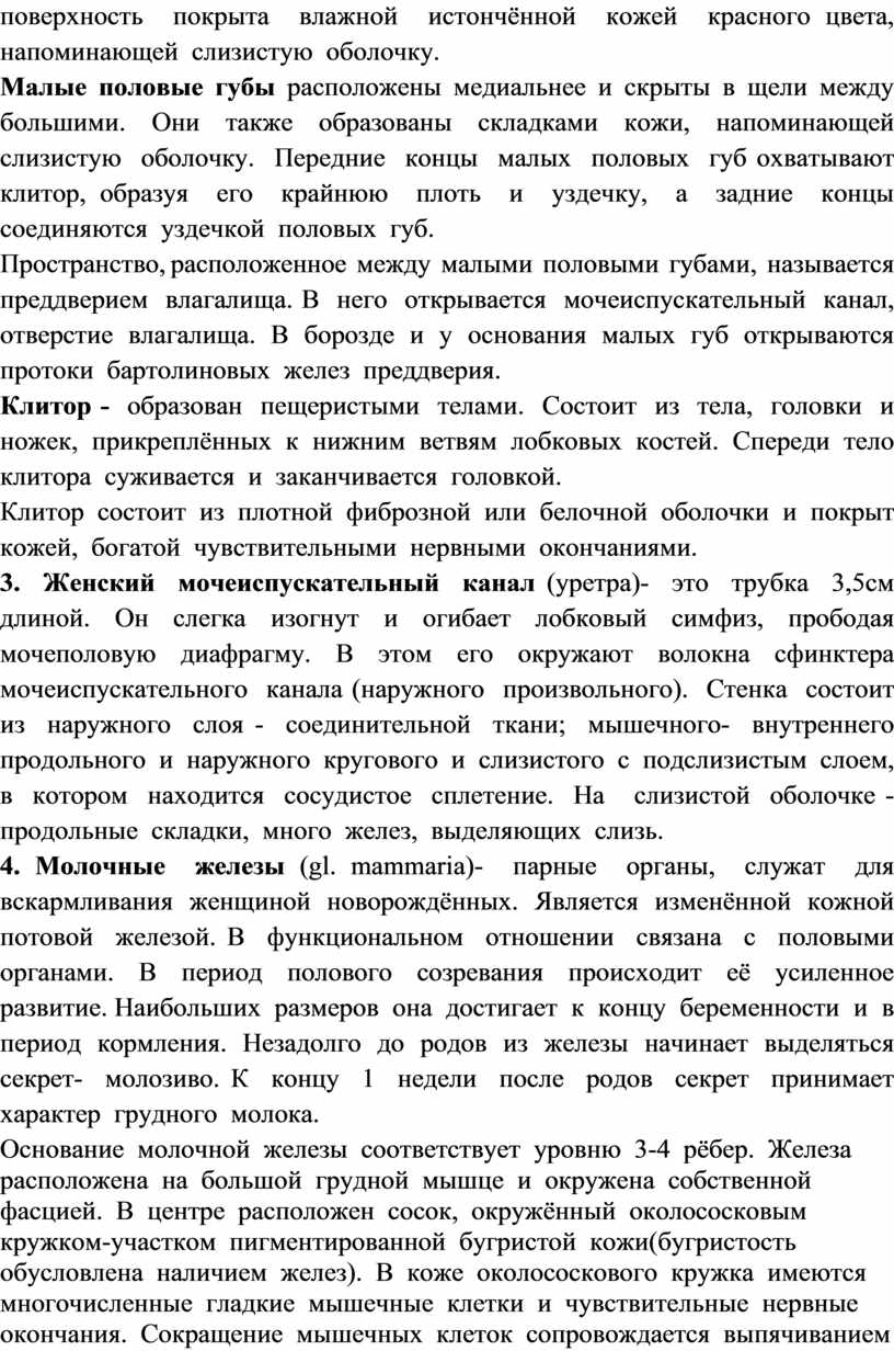 а) введение: Женские половые органы служат для роста и созревания женских половых клеток (яйцеклеток) и вынашивания плода. В женских половых железах яичниках вырабатываются женские половые гормоны. В зависимости от расположения различают внутренние и наружные половые органы. К внутренним женским половым органам (organa genitalia feminina) относятся: яичники, маточные трубы, матка и влагалище. К наружным большие и малые половые губы и клитор. Знание строения и функций женских половых органов необходимо для изучения в дальнейшем акушерства и гинекологии.
