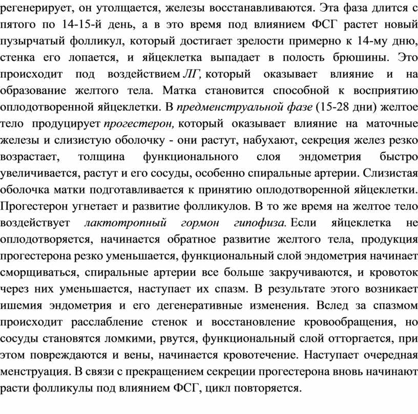 II. Маточный цикл. У девушек с наступлением половой зрелости и у небеременных женщин каждые 28-30 дней (лунный месяц) слизистая оболочка матки претерпевает цикл изменений, тесно связанный с процессами, происходящими в яичниках (овуляцией и образованием жёлтого тела). Выделяют три фазы маточного цикла, в ходе которых изменяется эндометрий.