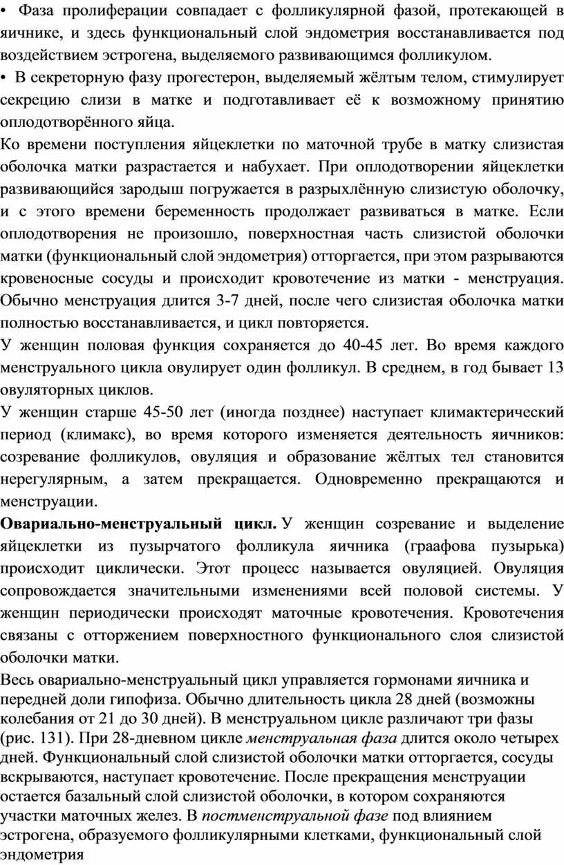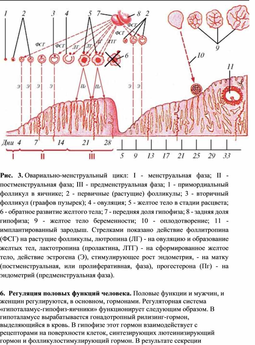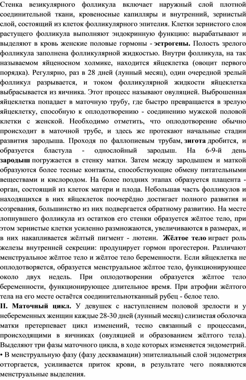 I. Яичниковый (овариальный) цикл. В яичнике половозрелой девушки (женщины) находится несколько сотен тысяч первичных фолликулов, происходит усиленный рост части первичных фолликулов, а также рост и созревание находящихся в них яйцеклеток. Зрелый вторичный фолликул называют также везикулярным (пузырчатым) яичниковым фолликулом (граафовым фолликулом). Он имеет форму пузырька диаметром 6-12 мм. Стенка везикулярного фолликула включает наружный слой плотной соединительной ткани, кровеносные капилляры и внутренний, зернистый слой, состоящий из клеток фолликулярного эпителия. Клетки зернистого слоя растущего фолликула выполняют эндокринную функцию: вырабатывают и выделяют в кровь женские половые гормоны - эстрогены. Полость зрелого фолликула заполнена фолликулярной жидкостью. Внутри фолликула, на так называемом яйценосном холмике, находится яйцеклетка (овоцит первого порядка). Регулярно, раз в 28 дней (лунный месяц), один очередной зрелый фолликул разрывается, и током фолликулярной жидкости яйцеклетка выбрасывается из яичника. Этот процесс называют овуляцией. Выброшенная яйцеклетка попадает в маточную трубу, где быстро превращается в зрелую яйцеклетку, способную к оплодотворению - соединению мужской половой клетки с женской. Необходимо отметить, что оплодотворение обычно происходит в маточной трубе, и здесь же протекают начальные стадии развития зародыша. Проходя по фаллопиевым трубам, зигота дробится, и образуется бластула - однослойный зародыш. На 6-9-й день зародыш погружается в стенку матки. Затем между зародышем и маткой образуются более тесные контакты, способствующие обмену питательными веществами и кислородом. На более поздних этапах образуется плацента - орган, состоящий из клеток матери и плода. Небольшая часть фолликулов и находящихся в них яйцеклеток поочерёдно достигает полного развития и созревания, большинство из них подвергается обратному развитию. На месте лопнувшего фолликула из остатков его стенки образуется жёлтое тело, при этом зернистые клетки усиленно размножаются, увеличиваются в размерах, и в них накапливается жёлтый пигмент - лютеин. Жёлтое тело играет роль железы внутренней секреции: продуцирует гормон прогестерон. Различают менструальное жёлтое тело и жёлтое тело беременности. Если яйцеклетка не оплодотворяется, образуется менструальное жёлтое тело, функционирующее около двух недель. При оплодотворении образуется жёлтое тело беременности, функционирующее длительное время. При атрофии жёлтого тела на его месте остаётся соединительнотканный рубец - белое тело.