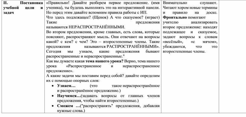 -Познакомить с понятиями «распространенное» и «нераспространенное» предложение; -Формировать умение отличать распространенное предложение от нераспространенного; -Совершенствовать навыки письма. |