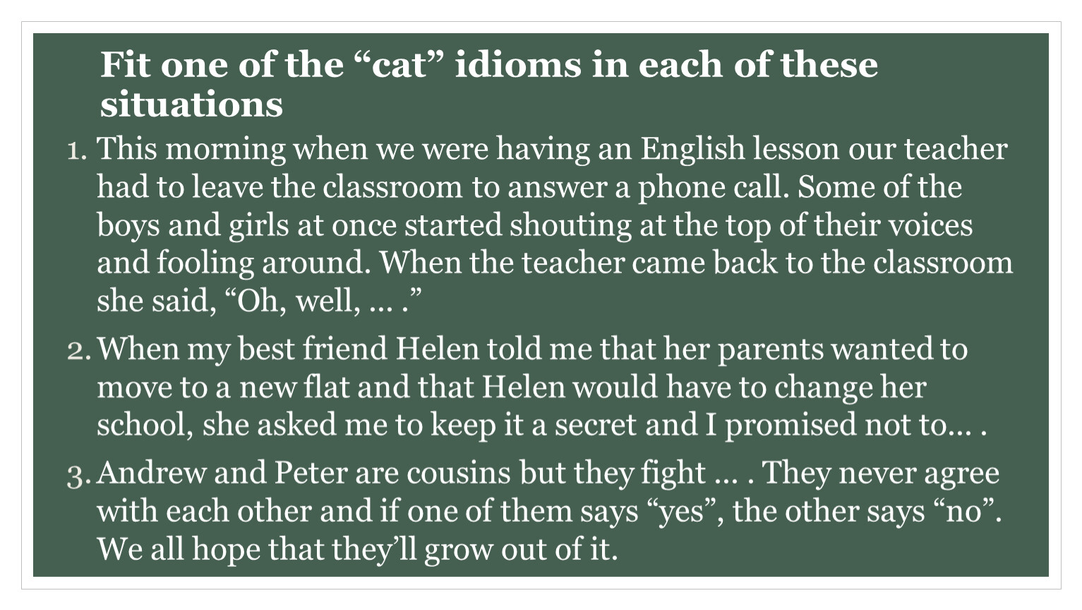 This morning when we were having an English lesson our teacher had to leave the classroom to answer a phone call. Some of the boys and girls at once started shouting at the top of their voices and fooling around. When the teacher came back to the classroom she said, “Oh, well, ... .”