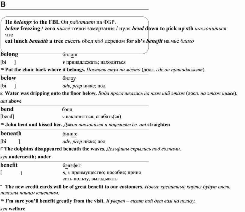 eat lunch beneath a tree съесть обед под деревом for sb’s benefit на чье благо