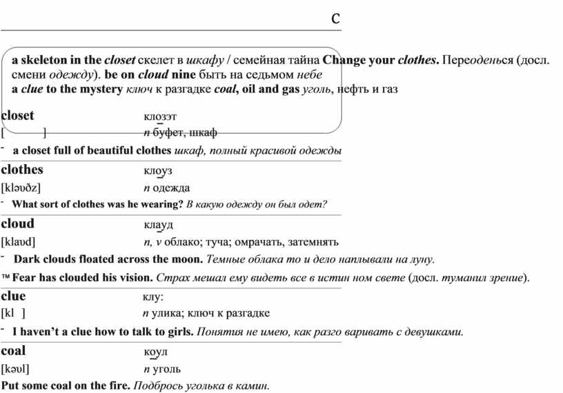a skeleton in the closet скелет в шкафу / семейная тайна Change your clothes. Переоденься (досл. смени одежду). be on cloud nine быть на седьмом небе