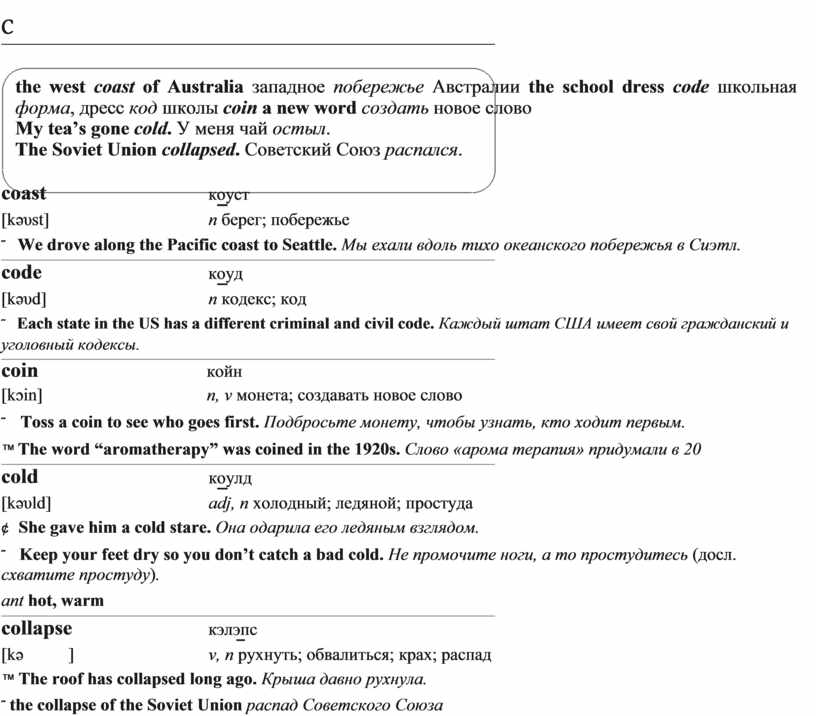 the west coast of Australia западное побережье Австралии the school dress code школьная форма, дресс код школы coin a new word создать новое слово