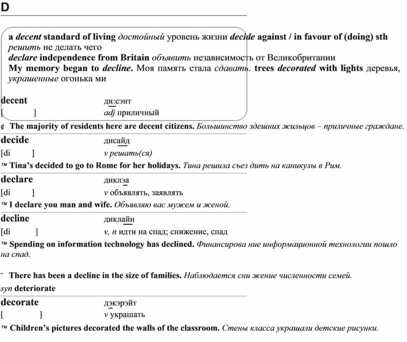 a decent standard of living достойный уровень жизни decide against / in favour of (doing) sth решить не делать чего