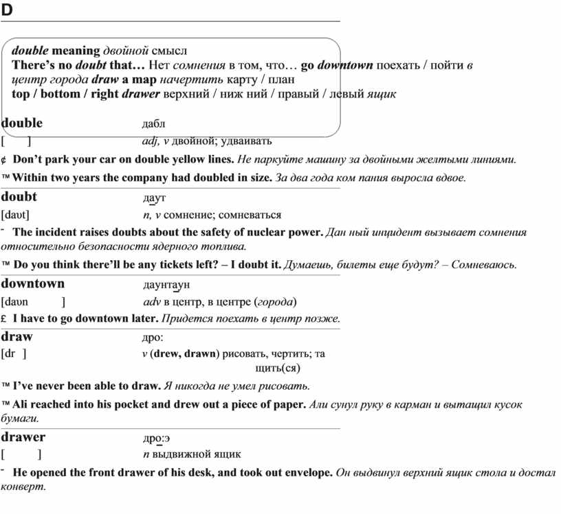 There’s no doubt that… Нет сомнения в том, что… go downtown поехать / пойти в центр города draw a map начертить карту / план
