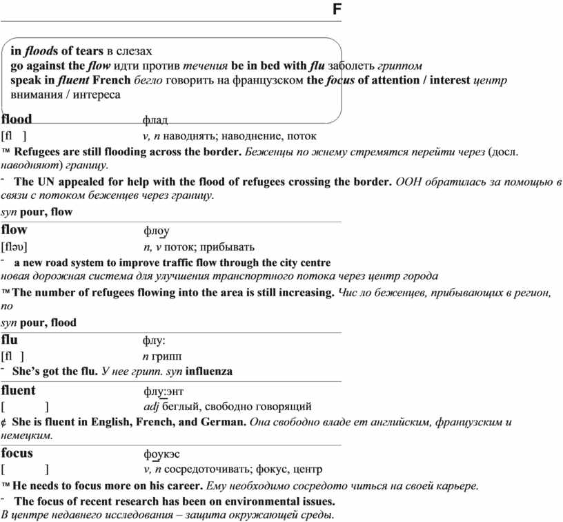 speak in fluent French бегло говорить на французском the focus of attention / interest центр внимания / интереса