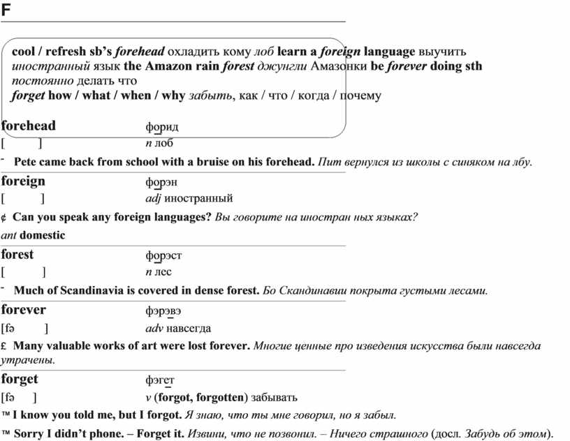 cool / refresh sb’s forehead охладить кому лоб learn a foreign language выучить иностранный язык the Amazon rain forest джунгли Амазонки be forever doing sth постоянно делать что
