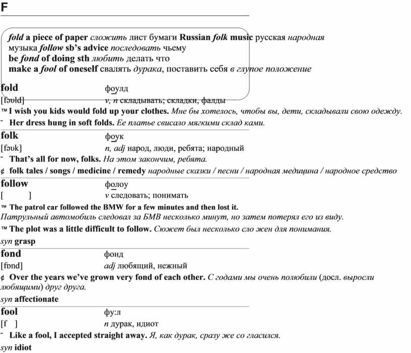 fold a piece of paper сложить лист бумаги Russian folk music русская народная музыка follow sb’s advice последовать чьему