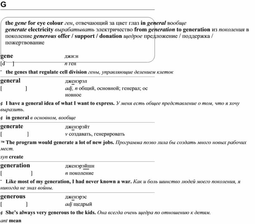 generate electricity вырабатывать электричество from generation to generation из поколения в поколение generous offer / support / donation щедрое предложение / поддержка / пожертвование