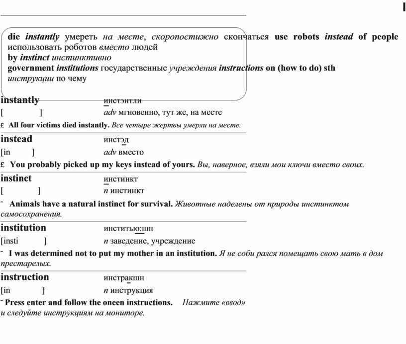 die instantly умереть на месте, скоропостижно скончаться use robots instead of people использовать роботов вместо людей