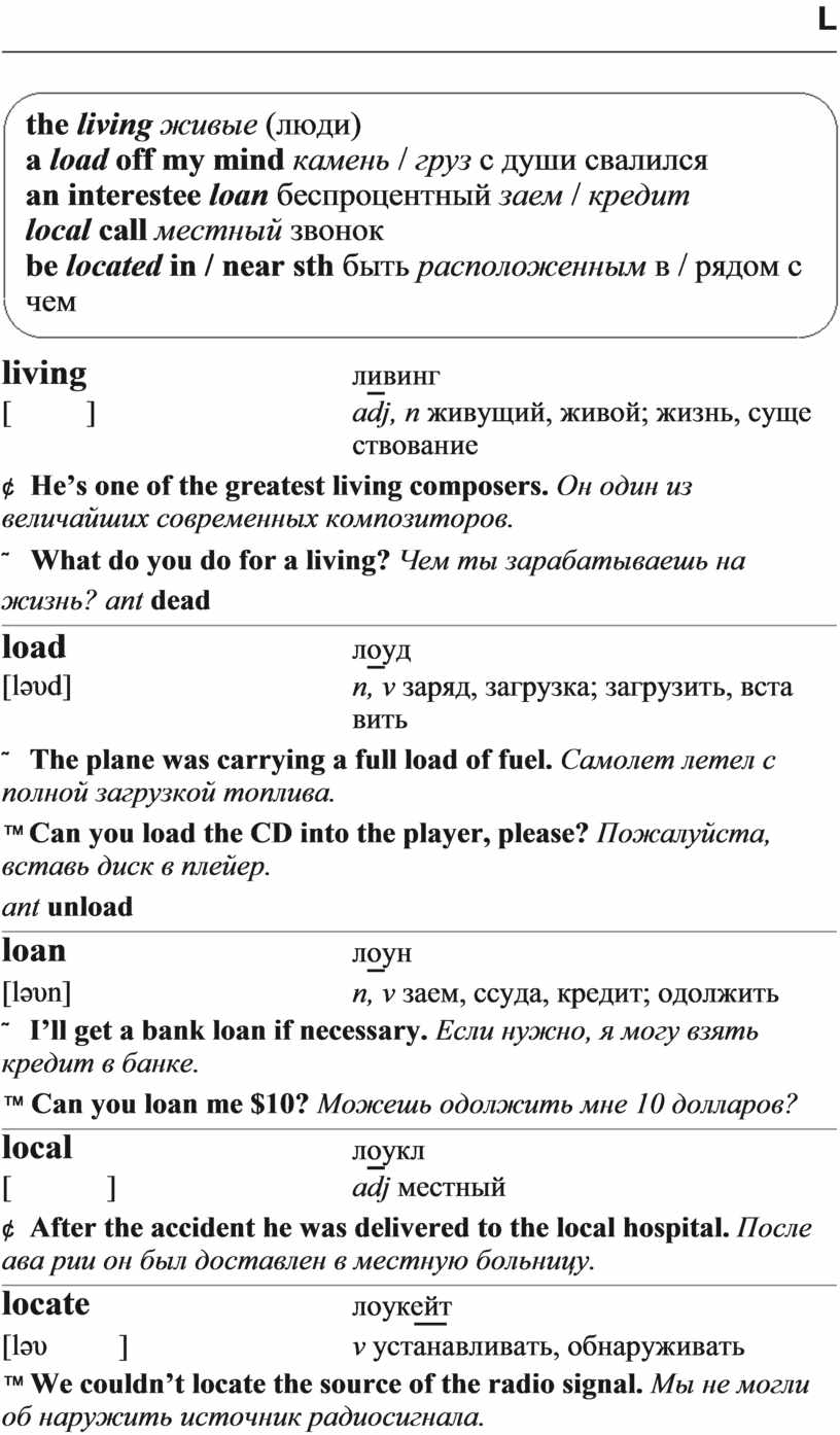 a load off my mind камень / груз с души свалился an interestee loan беспроцентный заем / кредит local call местный звонок