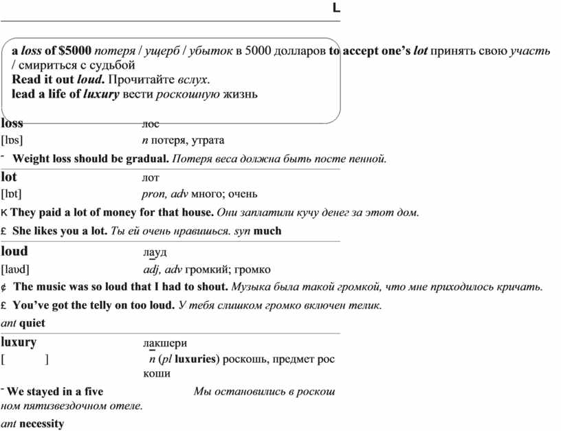 a loss of $5000 потеря / ущерб / убыток в 5000 долларов to accept one’s lot принять свою участь / смириться с судьбой