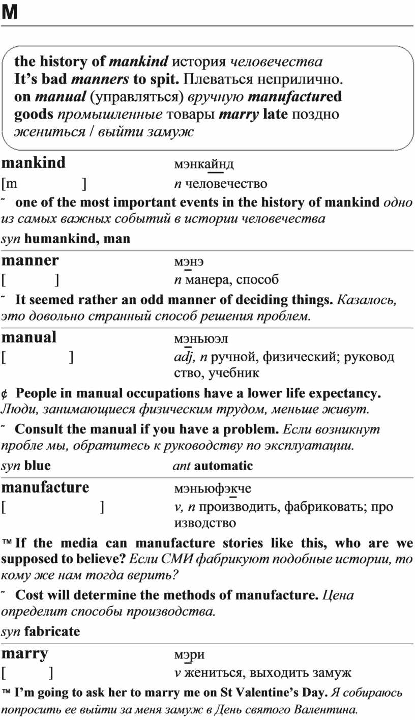 the history of mankind история человечества It’s bad manners to spit. Плеваться неприлично. on manual (управляться) вручную manufactured goods промышленные товары marry late поздно жениться / выйти замуж