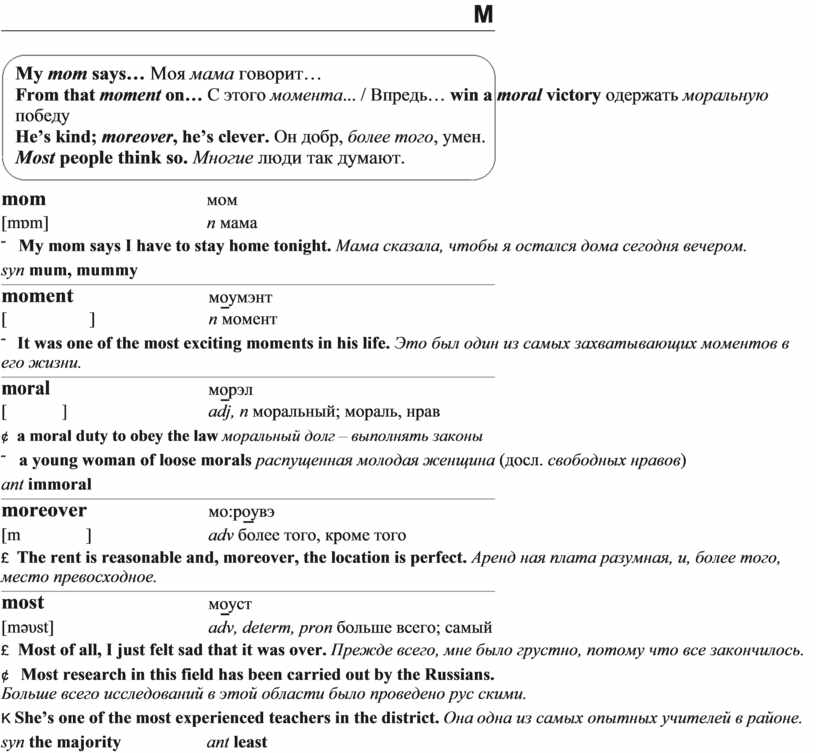adj, n моральный; мораль, нрав |