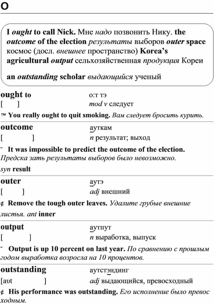 I ought to call Nick. Мне надо позвонить Нику. the outcome of the election результаты выборов outer space космос (досл. внешнее пространство) Korea’s agricultural output сельхозяйственная продукция Кореи