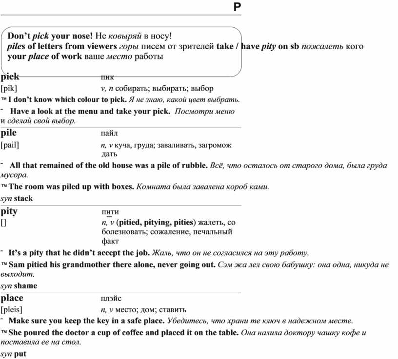 piles of letters from viewers горы писем от зрителей take / have pity on sb пожалеть кого your place of work ваше место работы