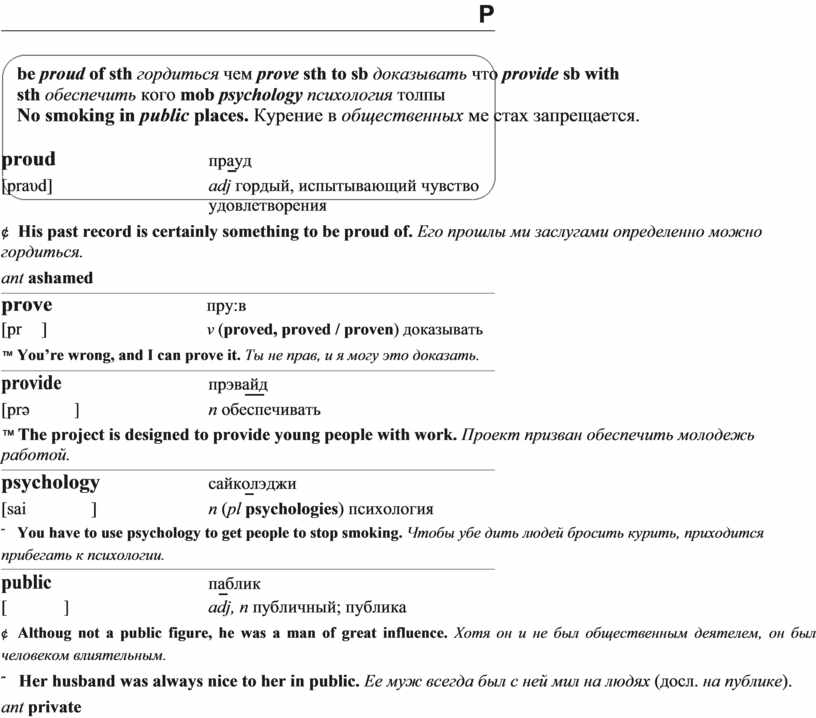 be proud of sth гордиться чем prove sth to sb доказывать что provide sb with sth обеспечить кого mob psychology психология толпы