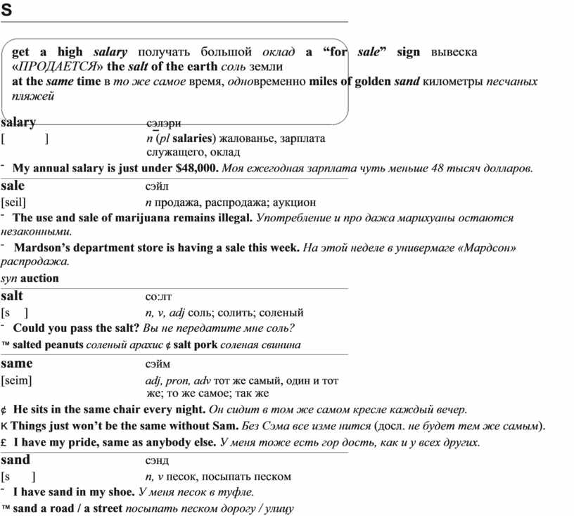 get a high salary получать большой оклад a “for sale” sign вывеска «ПРОДАЕТСЯ» the salt of the earth соль земли