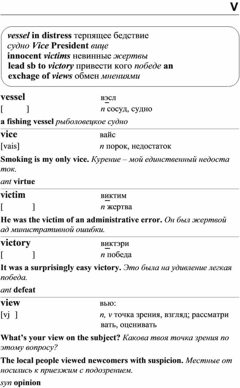 lead sb to victory привести кого победе an exchage of views обмен мнениями