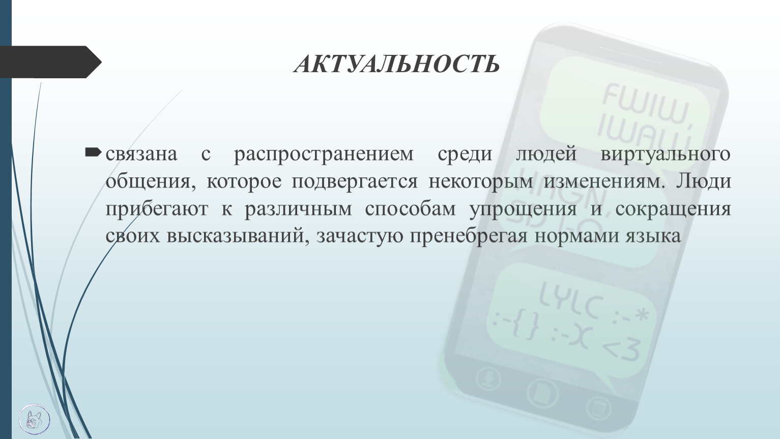 связана с распространением среди людей виртуального общения, которое подвергается некоторым изменениям. Люди прибегают к различным способам упрощения и сокращения своих высказываний, зачастую пренебрегая нормами языка