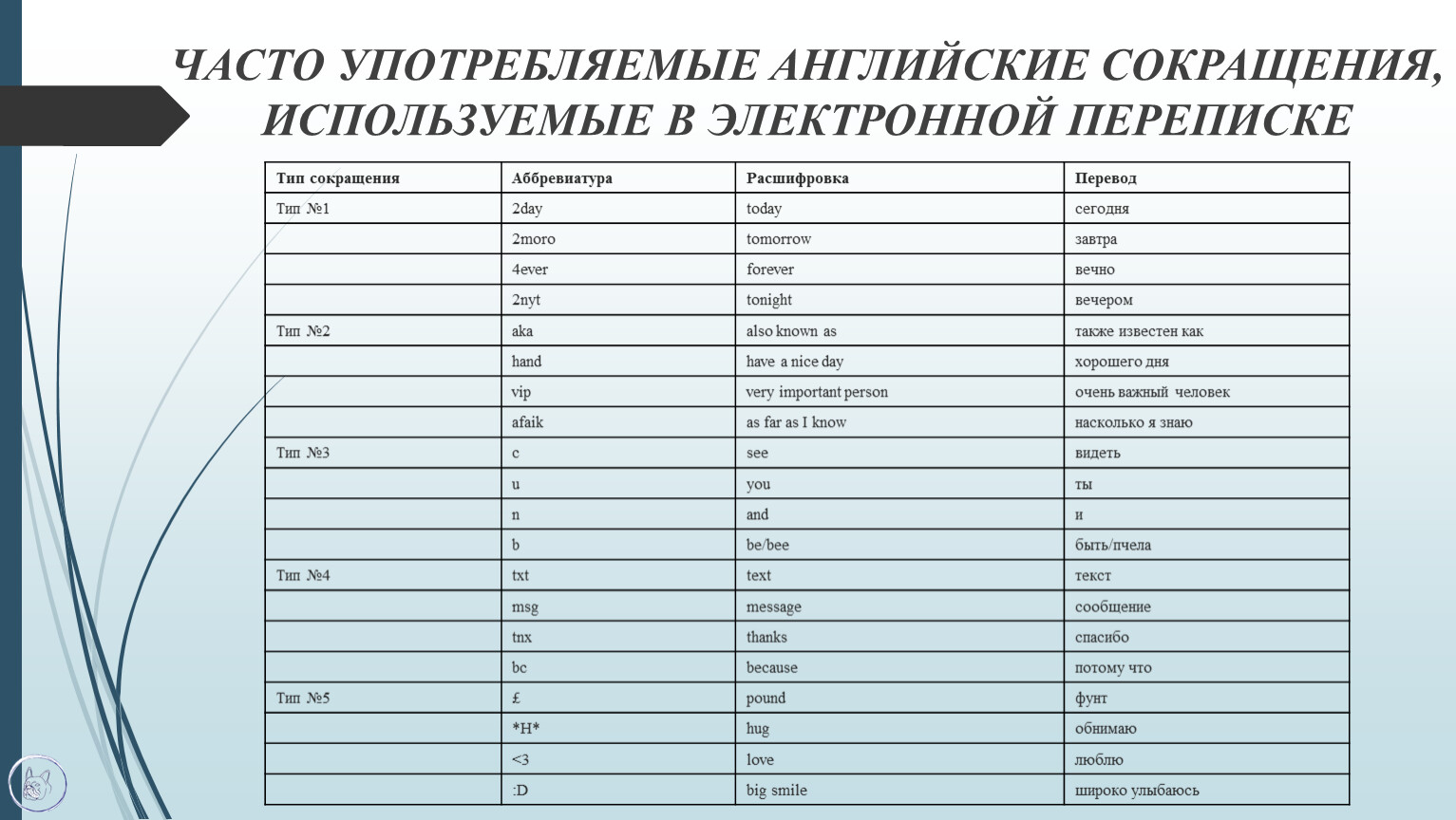 ЧАСТО УПОТРЕБЛЯЕМЫЕ АНГЛИЙСКИЕ СОКРАЩЕНИЯ, ИСПОЛЬЗУЕМЫЕ В ЭЛЕКТРОННОЙ ПЕРЕПИСКЕ