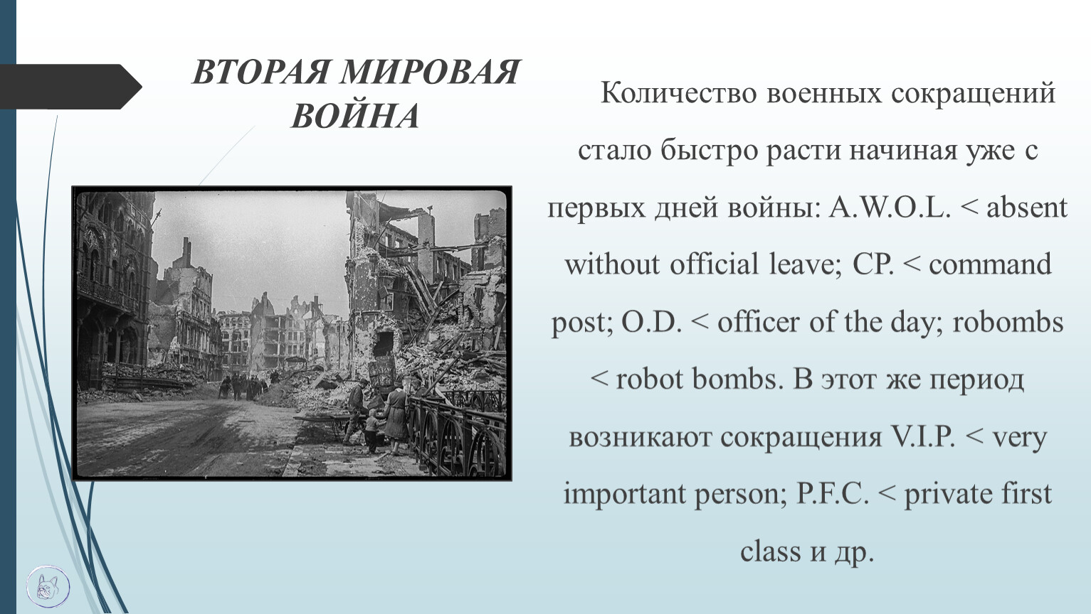 Количество военных сокращений стало быстро расти начиная уже с первых дней войны: A.W.O.L. < absent without official leave; СР. < command post; O.D. < officer of the day; robombs < robot bombs. В этот же период возникают сокращения V.I.P. < very important person; P.F.C. < private first class и др.