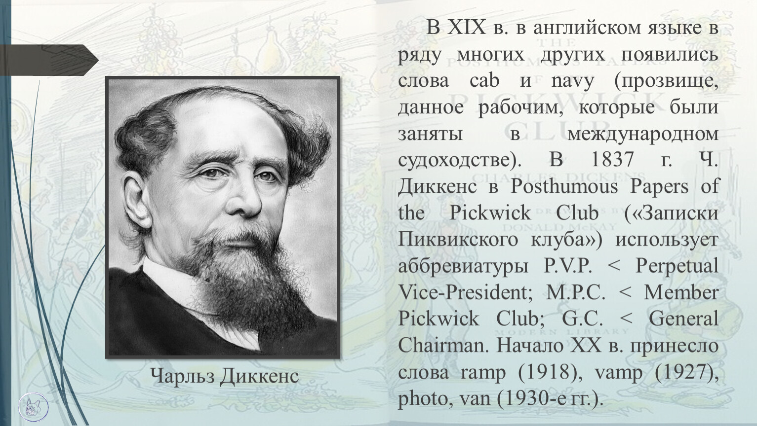 В XIX в. в английском языке в ряду многих других появились слова cab и navy (прозвище, данное рабочим, которые были заняты в международном судоходстве). В 1837 г. Ч. Диккенс в Posthumous Papers of the Pickwick Club («Записки Пиквикского клуба») использует аббревиатуры P.V.P. < Perpetual Vice-President; М.Р.С. < Member Pickwick Club; G.C. < General Chairman. Начало XX в. принесло слова ramp (1918), vamp (1927), photo, van (1930-е гг.).