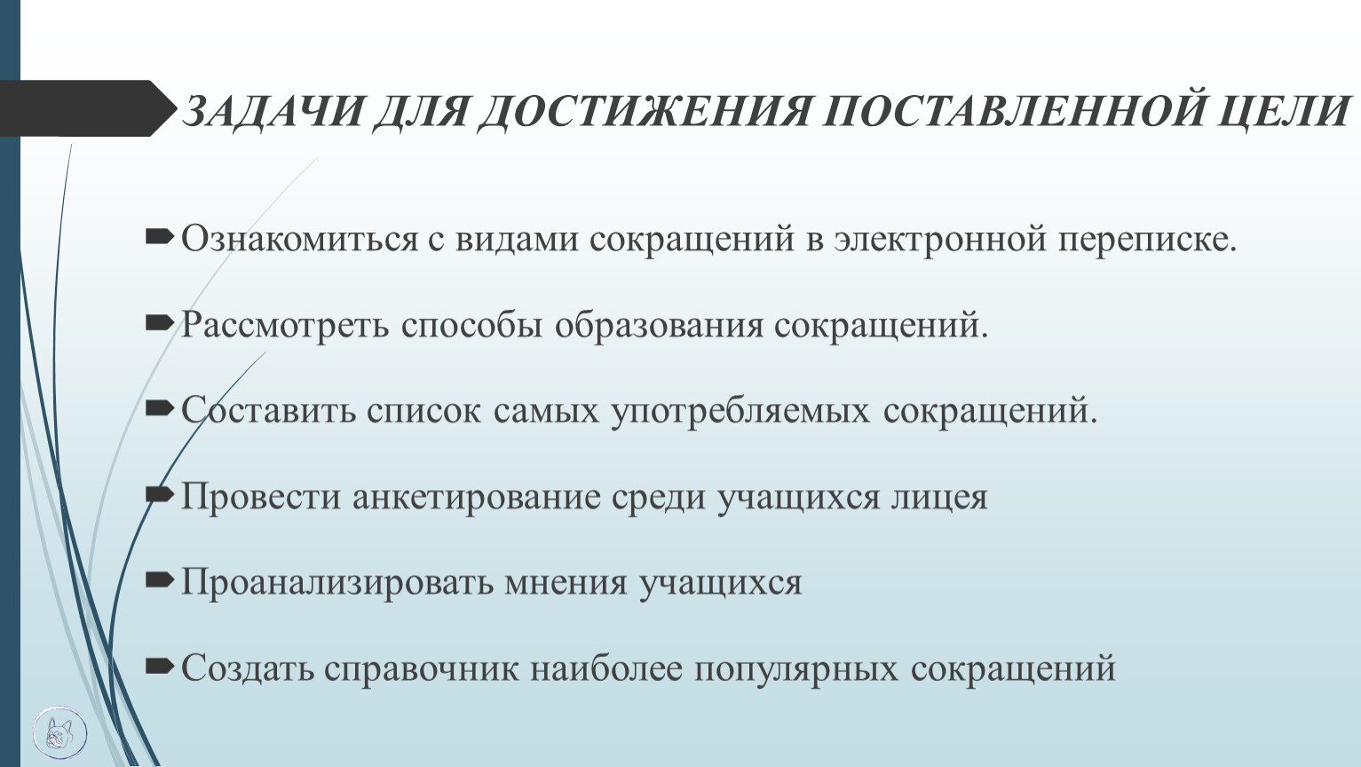 ЗАДАЧИ ДЛЯ ДОСТИЖЕНИЯ ПОСТАВЛЕННОЙ ЦЕЛИ