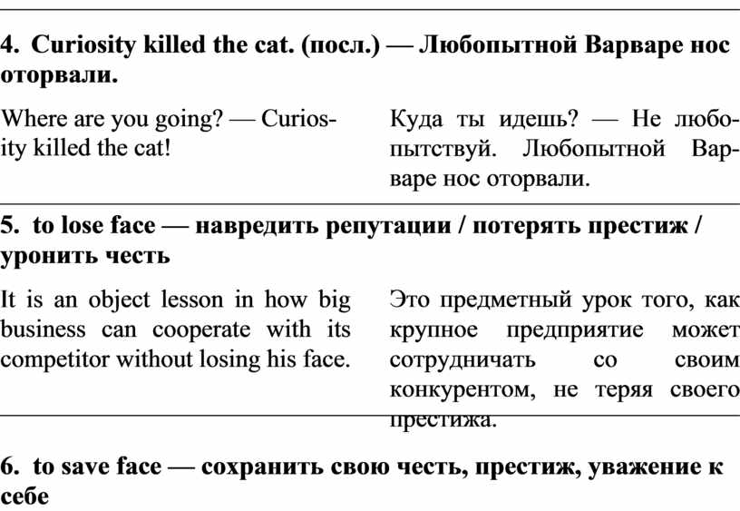 6. to save face — сохранить свою честь, престиж, уважение к себе